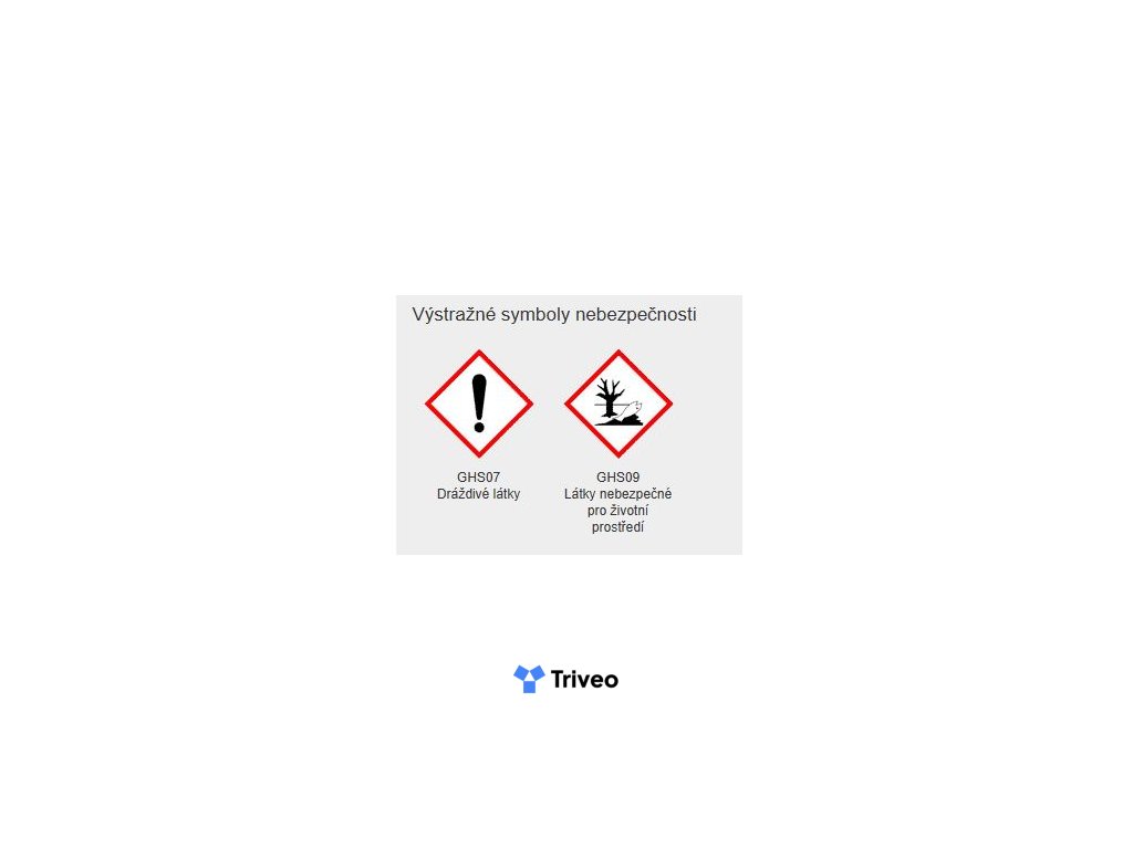 Varovanie. H319 Spôsobuje vážne podráždenie očí. H411 Toxický pre vodné organizmy, s dlhodobými účinkami. H302+H312+H332 Škodlivý po požití, pri kontakte s pokožkou alebo pri vdýchnutí. P101 Ak je potrebná lekárska pomoc, majte poruke obal alebo štítok výrobku. P102 Uchovávajte mimo dosahu detí. P264 Po manipulácii starostlivo umyte ruky a zasiahnuté časti tela. P271 Používajte iba vonku alebo v dobre vetraných priestoroch. P391 Uniknutý produkt zoberte. P501 Odstráňte obsah/obal odovzdaním oprávnenej osobe na nakladanie s odpadmi alebo vrátením dodávateľovi.