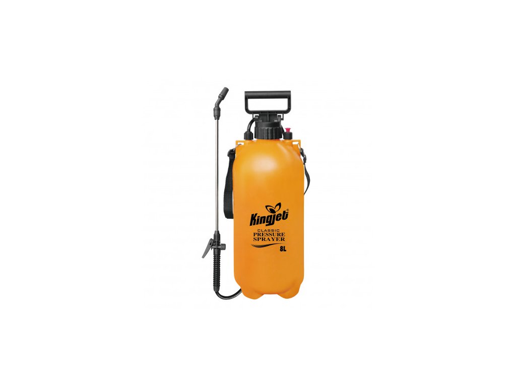Postrekovač tlakový l KINGJET. Obsahuje nastaviteľnú trysku s možnosťou zaistenia stáleho postreku, nerezový nástavec. Celková pracovná kapacita je 8 litrov. Nachádza sa tu tak isto aj bezpečnostný ventil, tlak 2,5bar. Výrobca: KINGJETDodatočné parametre